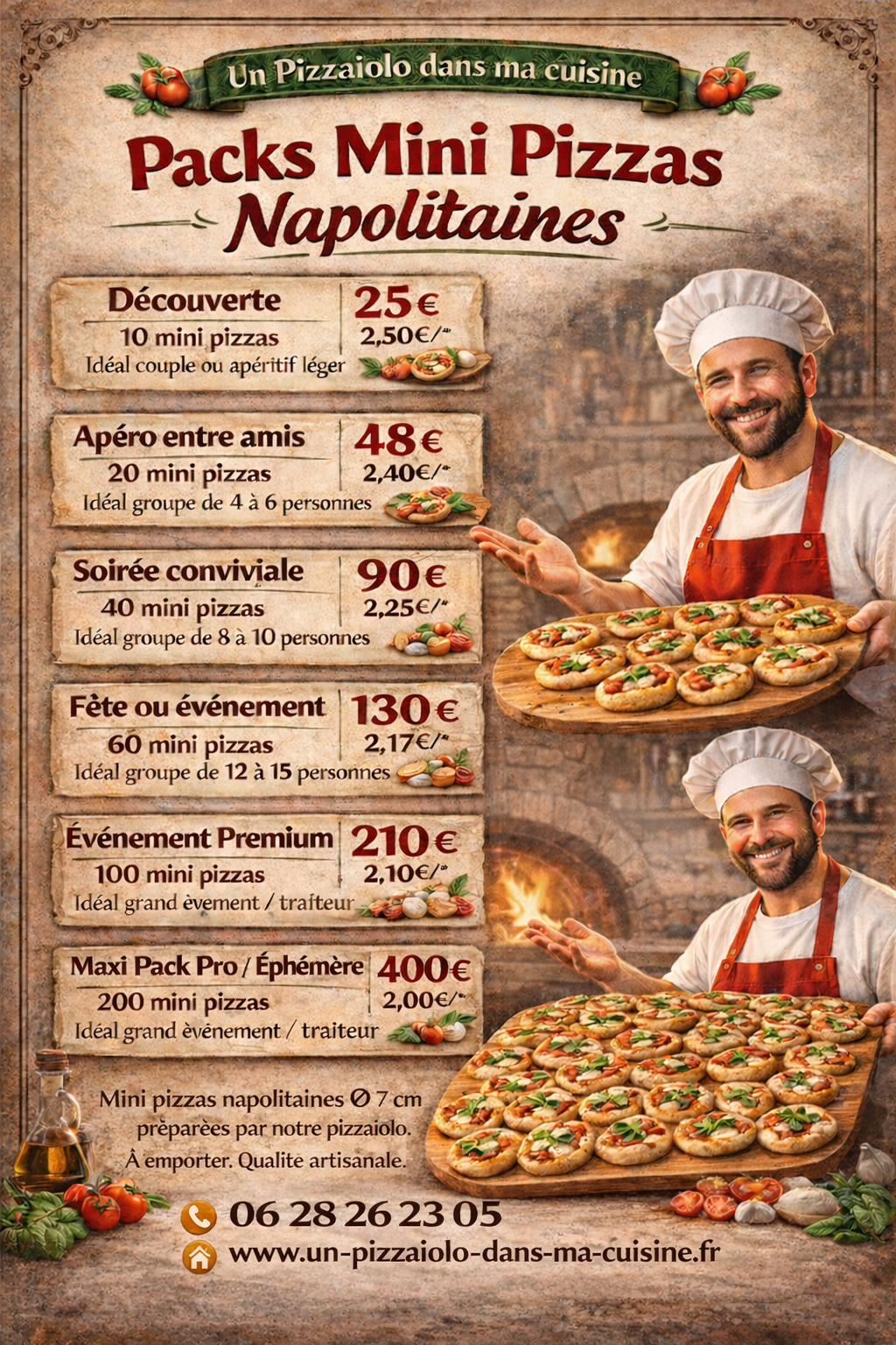 Nos mini pizzas napolitaines sont préparées artisanalement avec pate maturées de 24 heures, façonnage à la main et cuisson au four napolitain.